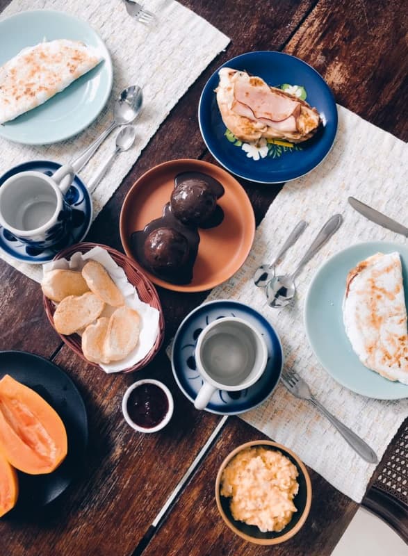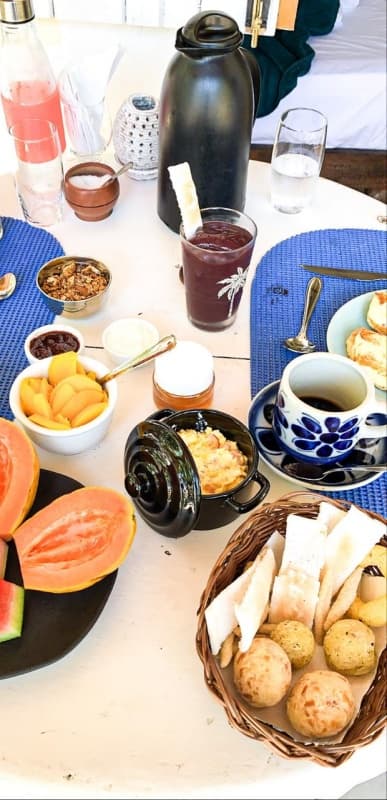 Nosso cardápio incluí vitaminas, suco de açaí, suco de laranja e outras frutas da região, toast feito com nosso pão caseiro, integral e sem glúten, diferentes tipos de geleias produzidas na pousada, tapiocas recheadas, frutas da estação, iogurte caseiro com granola (há opções veganas) e mel (ou melado), bolos (que também podem ser sem glúten e sem lactose), ovos mexidos especiais e ainda nossa cesta de pães de queijo e pães veganos feitos aqui na casa.